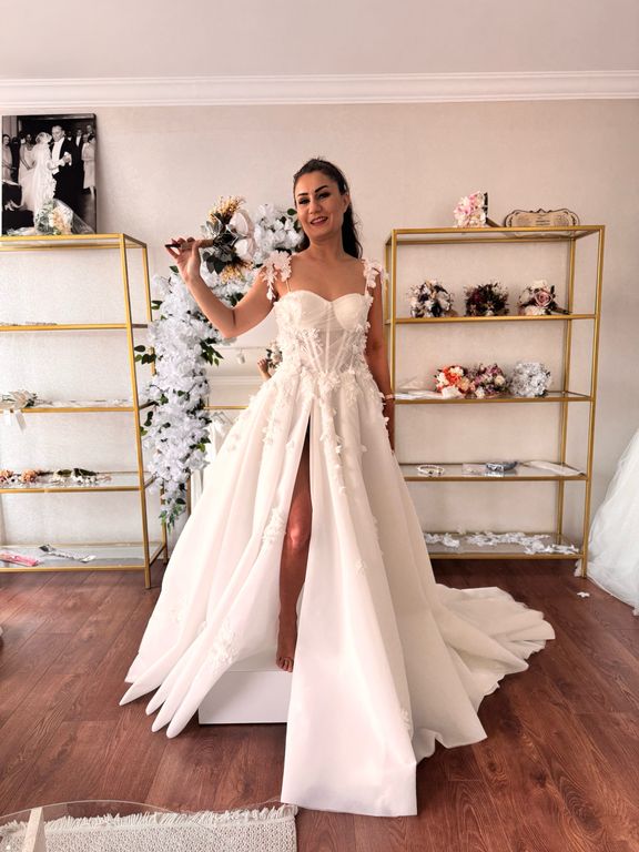 Yırtmaçlı, bedeni drapeli ve üzerinde üç boyutlu dantelleri bulunan gelinlik modeli.
