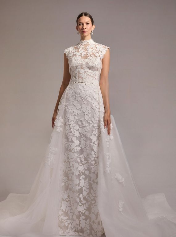 - İnce ve uzun bir boyna sahip gelinlere çok yakışan bu hakim yaka gelinlik, özellikle topuz gelin saçı ile kombinlenince çok şık bir görüntü yaratıyor.