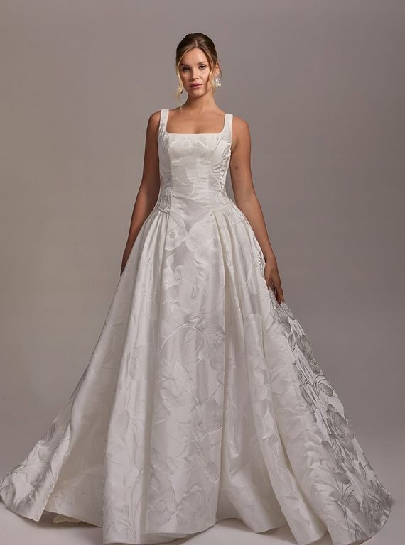 - Yakanın dik indiği bu kare yaka gelinlik, köprücük kemiği ile dekolte bölgesini öne çıkararak, zarif bir görüntü yaratıyor.