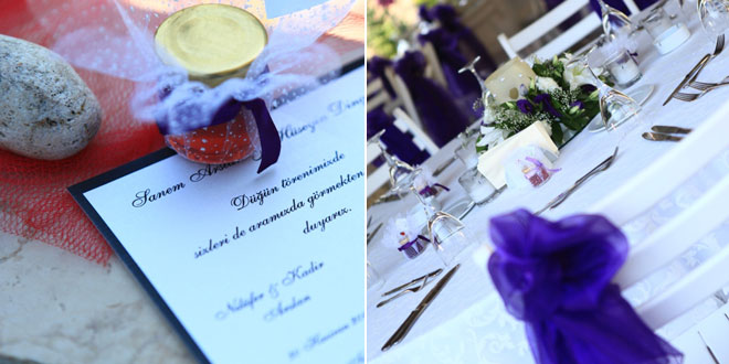 Kır düğünü olacağı için mümkün olduğunca sade bir düğün tercik ettik, masa süsü olarak yalnızca çiçek ve mum kullanıldı, tahta sandalyeler mor ve lila tüllerle süslendi. Düğünde ikram edilecek yemekleri önceden tadarak menüye karar verdiğimiz için yemek konusunda da içimiz rahattı.