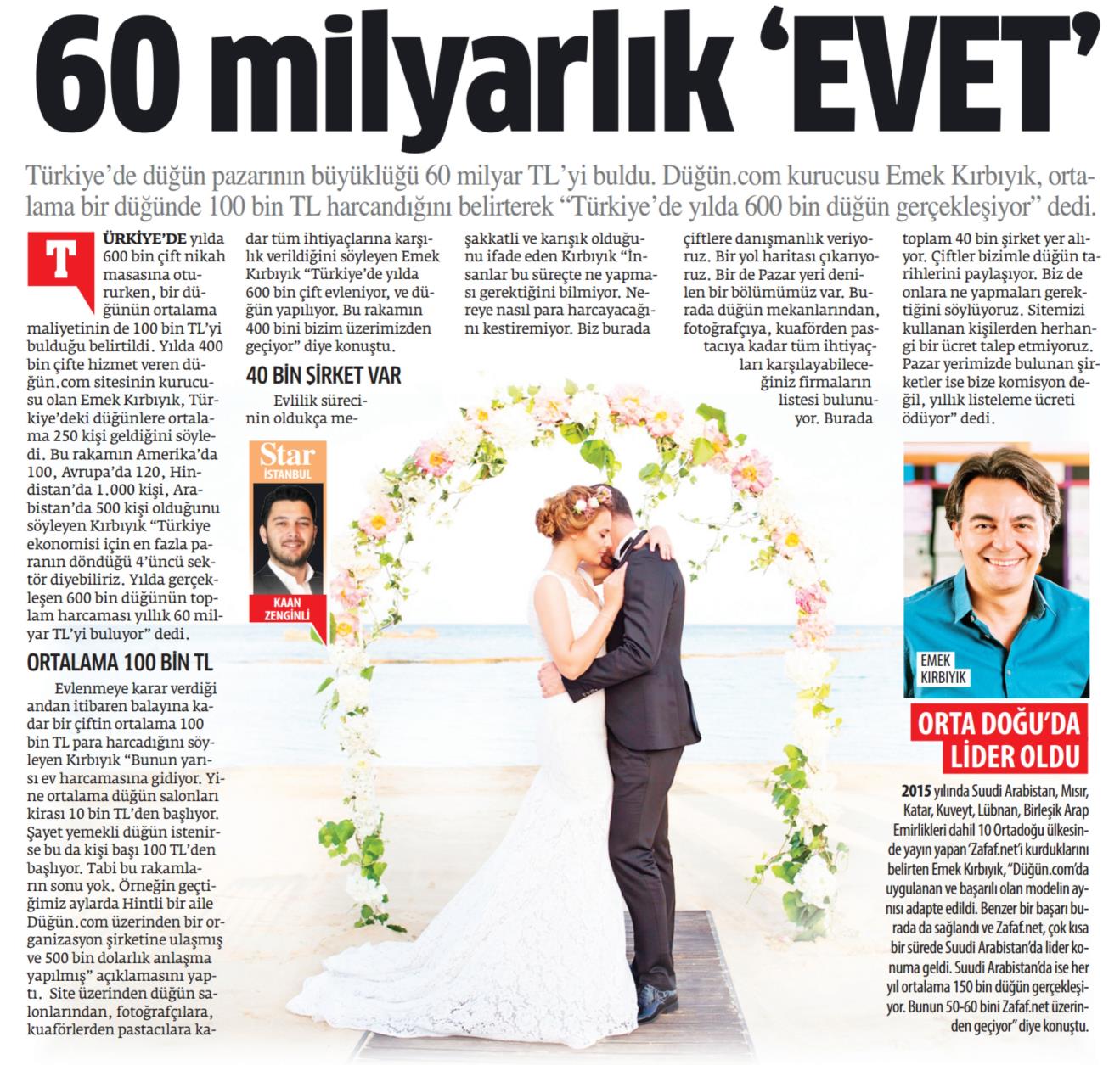 CEO'muz Emek Kırbıyık, düğünün yarattığı ekonominin büyüklüğünü Star Gazetesi'ne anlattı. 15 Aralık 2019 tarihli yayının öne çıkan satır başları şöyle: