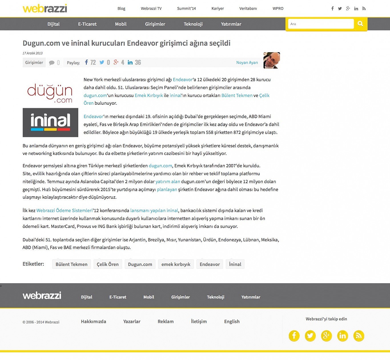 Düğün.com ve İninal kurucuları Endeavor girişimci ağına seçildi