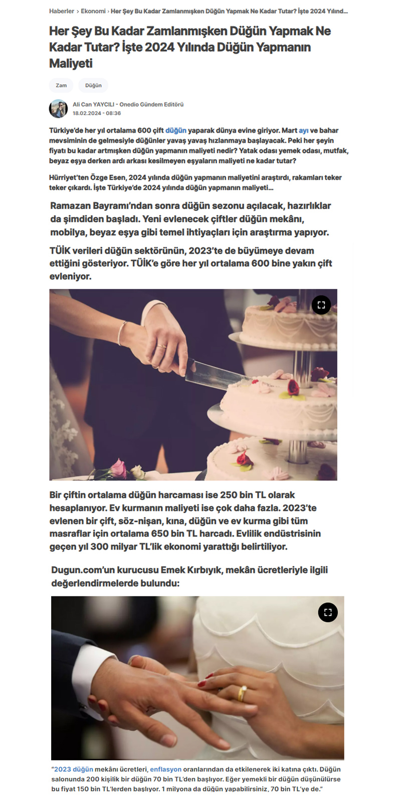 Düğün sürecinde çiftlerin masraf kalemleri, sektör yetkililerin piyasaya ilişkin yorumları ve beklentileri Onedio.com'da yer aldı. Düğün.com CEO'su Emek Kırbıyık, mekan ücretleriyle ilgili değerlendirmelerde bulundu.