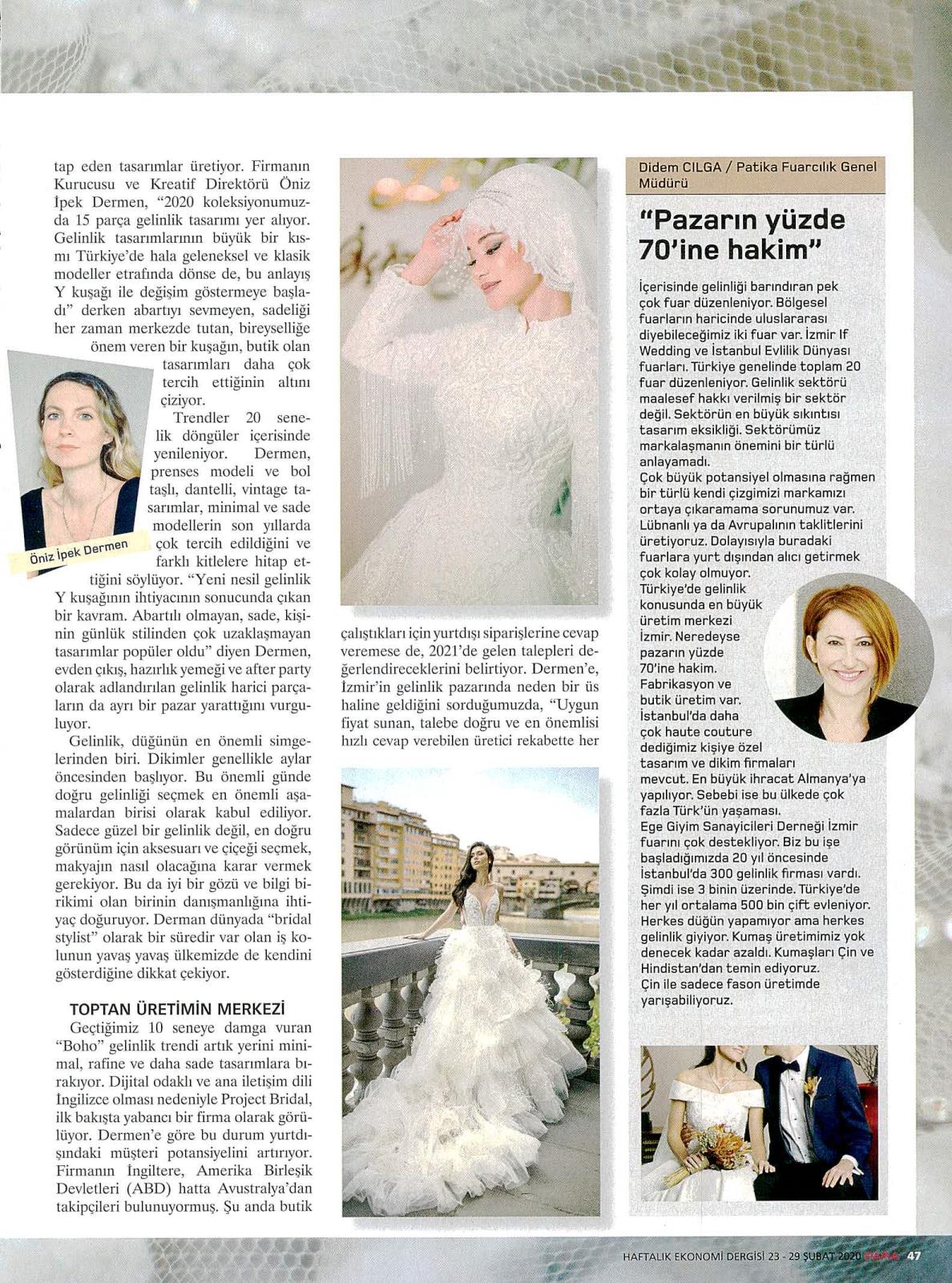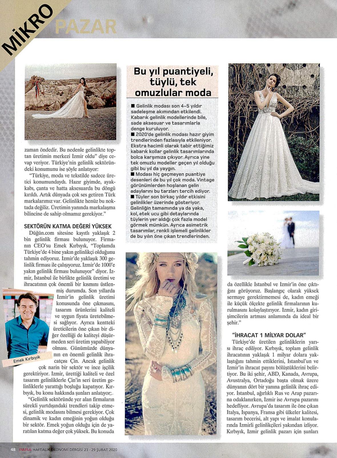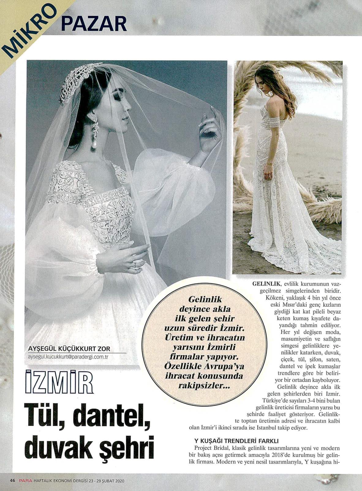 CEO'muz Emek Kırbıyık, Para dergisinin Şubat 2020 sayısında gelinlik sektörü ve İzmir'in bu alanda hızlı yükselişine ilişkin görüşlerini aktardı. Demeçten öne çıkan başlıklar şunlar: