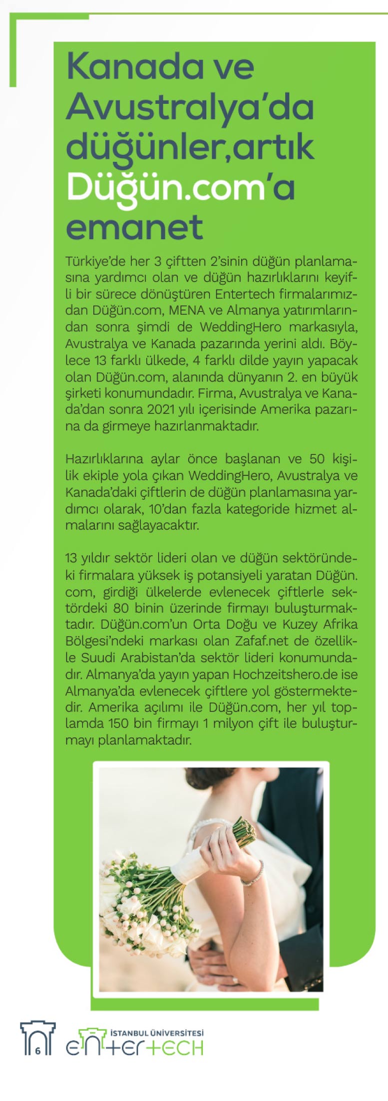 İstanbul Üniversitesi Teknokent çatısı altında çıkarılan Entertech dergisinin 2021 Ocak-Mart sayısında Düğün.com'un Kanada ve Avustralya'da faaliyete başlayan WeddingHero projesine ilişkin detaylara yer verildi.