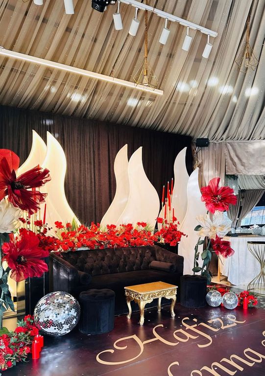 Mekan aydınlatmasında lüks görünümlü uzun bir avize ve sarı ışıklı sarkıt avizeler kullanmayı tercih ediyoruz. Misafirlerinizi yuvarlak veya uzun banket masalarında ağırlıyor, masalarımızı üstü dantel süslü örtülerle güzelleştiriyoruz. Altın rengi şamdanlarımız ve altın kenarlıklı suplalarımız da mekanımızın genel süslemesiyle uyum sağlıyor. Bej renkli, altın varaklı kına tahtınızıysa arka fonumuzun önüne yerleştiriyor, iki yanını tül veya çiçek detaylı kapı dekorlarıyla süslüyoruz.