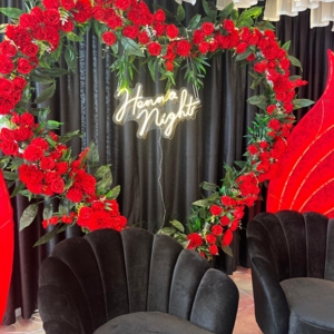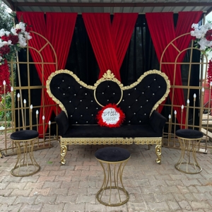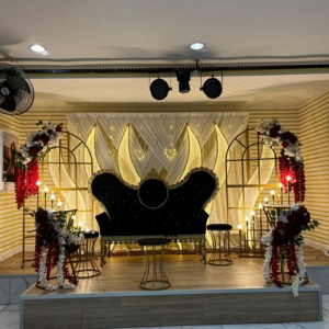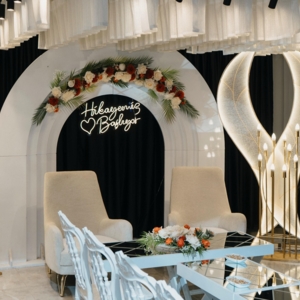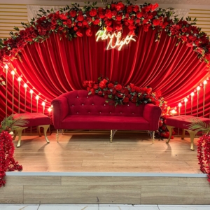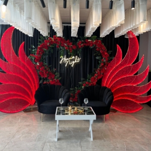 Gecenizin merkezinde yer alacak kına tahtımızı siyah veya kırmızı renk alternatifleriyle sunuyoruz. Arka planda kullanılan kırmızı fon ile geleneksel kına ambiyansını tamamlıyoruz. Etkileyici neon ışıklandırmalarla sahneye modern bir dokunuş katıyor, Tiffany sandalyelerle oturma düzenini sağlarken mekanın genel havasını uyumlu hale getiriyoruz. Tüm bu detaylarda isteklerinizi ön planda tutuyoruz.