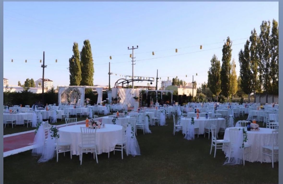 Bahçede beyaz tiffany sandalyeler ve yuvarlak masalarla sade bir düzen oluşturuluyor. Masalarda kullanılan çiçek aranjmanları doğal bir görünüm sağlıyor. Aydınlatmalar, ağaçlar arasında uzanan sarı tonlu ampullerle sıcak bir ambiyans yaratıyor. Gelin yolu tüller ve yeşil dokularla hazırlanarak romantik bir giriş sunuyor. Bu genel düzen, Aksaray kır düğünü konseptlerine uygun huzurlu bir atmosfer oluşturulmasına yardımcı oluyor.