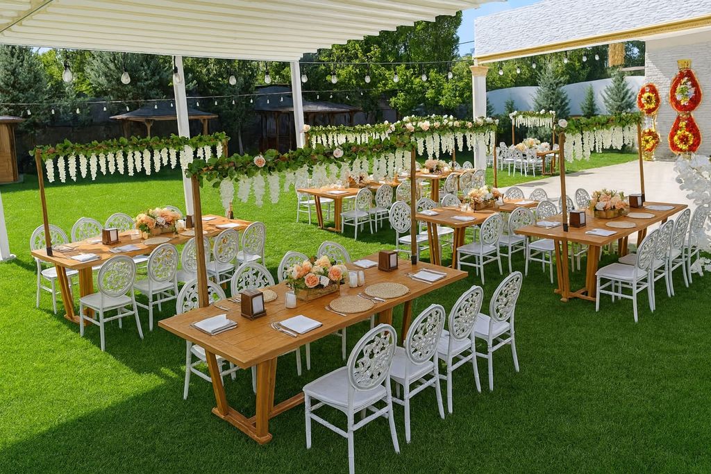 Bahçe ve kır manzarasıyla öne çıkan davet alanımız rustik atmosferiyle gerçek bir kır düğünü tecrübesi sunuyor. Bahçemizin dekorasyonunu bohem süslemelerle de zenginleştirerek romantik bir düğün konsepti hazırlayabiliyoruz. Davetlilerinizi isteğinize göre yuvarlak veya uzun masalarda ağırlıyoruz. Masa üstlerinde konsepte göre hasır supla veya ayna jardinyer gibi detaylar kullanıyoruz. Beyaz renkli lake veya tiffany sandalyelerle de oturma düzenini tamamlıyoruz.
