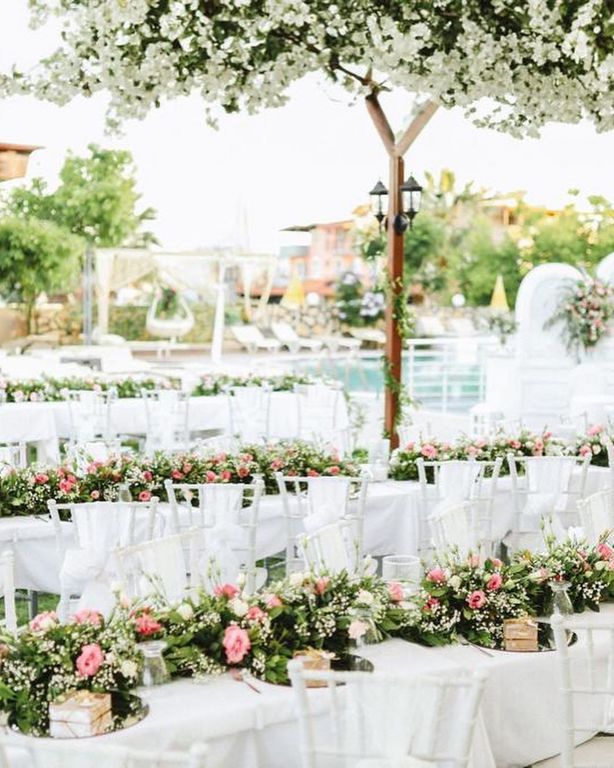 Cevizli Bahçe’de dekorasyon anlayışı doğal, romantik ve zarif detaylar üzerine kuruluyor. Uzun dikdörtgen masalar beyaz örtülerle hazırlanıyor, masa ortalarında pastel tonlarda çiçek aranjmanları kullanılıyor. Beyaz sandalyeler ve yeşilliklerle süslenmiş alan düzeniyle bütünlük sağlanıyor. Bu estetik yaklaşım, Aydın kır düğün salonları arasında mekanı öne çıkaran bir görünüm sunuyor. Doğayla uyumlu dekorasyon, davetlere soft bir şıklık katıyor.