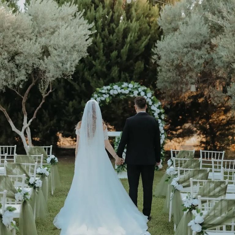Mekanda dekorasyon anlayışı doğal dokular ve sade şıklık üzerine kuruluyor. Çim alana yerleştirilen yuvarlak masalar, kır konseptine uyumlu şekilde düzenleniyor. Beyaz tonların hakim olduğu masa düzeni, çiçekler ve zarif aksesuarlarla tamamlanıyor. Gelin yolu, çiçekli ayaklar ve tül detaylarla süslenerek nikah alanına romantik bir geçiş sağlanıyor. Kullanılan dekoratif detaylar, doğayla bütünleşen samimi ve sıcak bir atmosfer oluşturuyor.