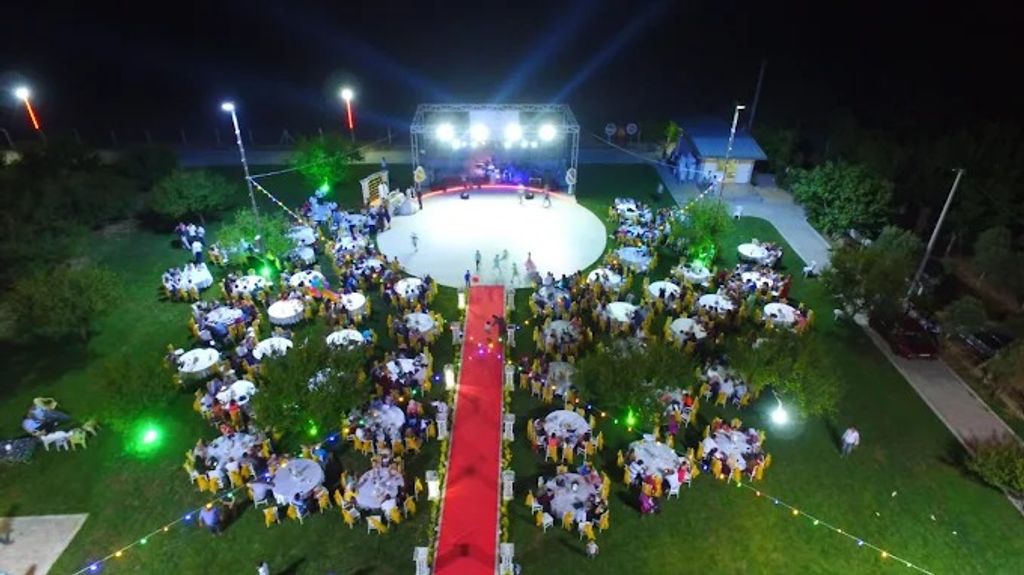 Aydın kır düğün salonu alternatiflerinden olan mekanın dekorasyonunda doğal ve romantik detaylar ön plana çıkıyor. Bahçe içerisinde beyaz masa örtüleri, sade masa süslemeleri ve ağaçlar arasına yerleştirilen ışıklandırmalar kullanılıyor. Kırmızı halı ile belirlenen yürüyüş yolu, sahneye doğru etkileyici bir geçiş sağlıyor. Sahne alanı ise ışık, ses ve sahne sistemleriyle güçlü bir odak noktası oluşturuyor.