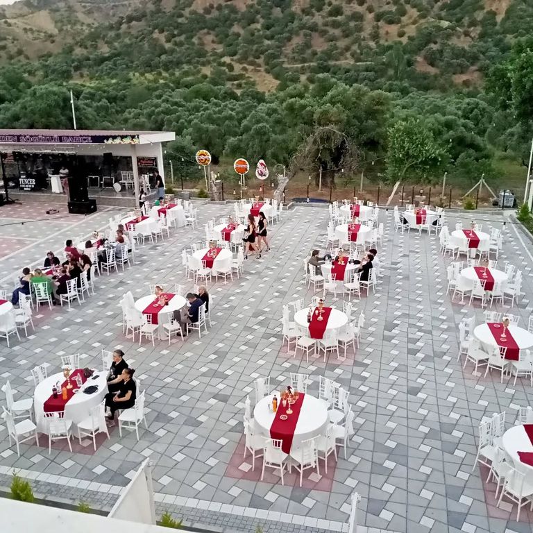 Mekan, açık alanda konumlanan geniş bir davet alanı sunuyor. Yuvarlak masa düzenleri ve dengeli yerleşim planı sayesinde misafirlerin rahatça hareket edebileceği bir düzen sağlanıyor. Alanın tamamı organizasyon akışına uygun şekilde planlanıyor. Sahne ve oturma alanları, davetin her noktasından rahat görüş sağlayacak biçimde konumlandırılıyor. Bu planlama, kalabalık davetlerde dahi düzenli ve konforlu bir atmosfer oluşmasına katkı sağlıyor.