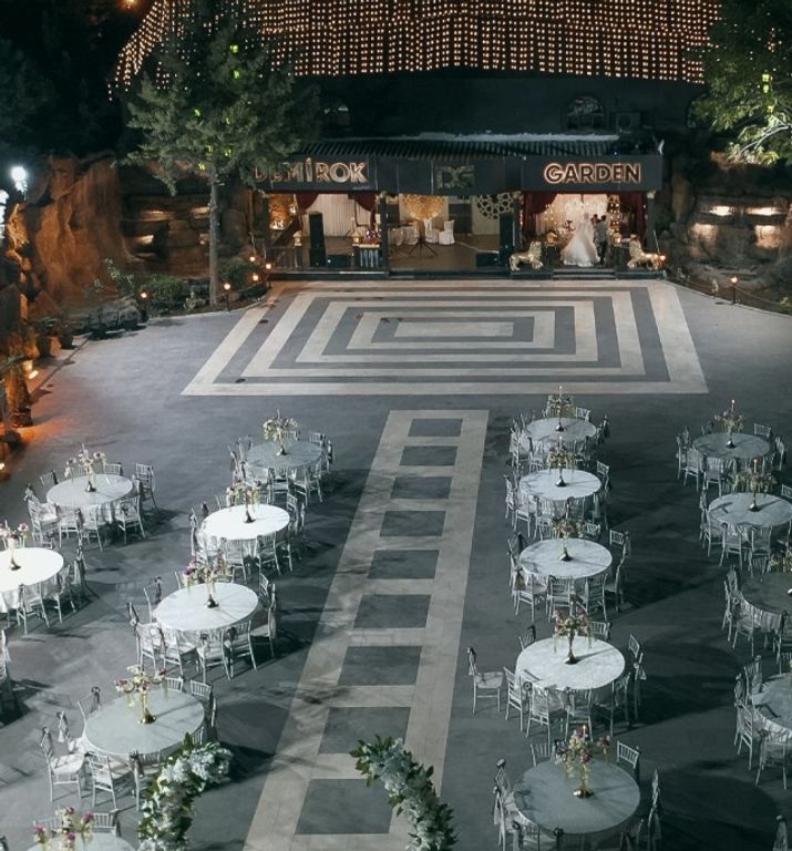 Demirok Wedding Hall, 50 ila 200 kişilik davetler için planlanmış ferah bir açık alan sunuyor. Geniş zemin yapısı sayesinde masa düzenleri rahatça yerleştirilebiliyor. Açık alanda kurulan düzen, davetlilerin hem oturma alanlarında hem de pist çevresinde konforlu şekilde vakit geçirmesine olanak tanıyor. Akşam organizasyonlarında aydınlatmalarla desteklenen alan, davetlere keyifli bir ambiyans kazandırıyor.