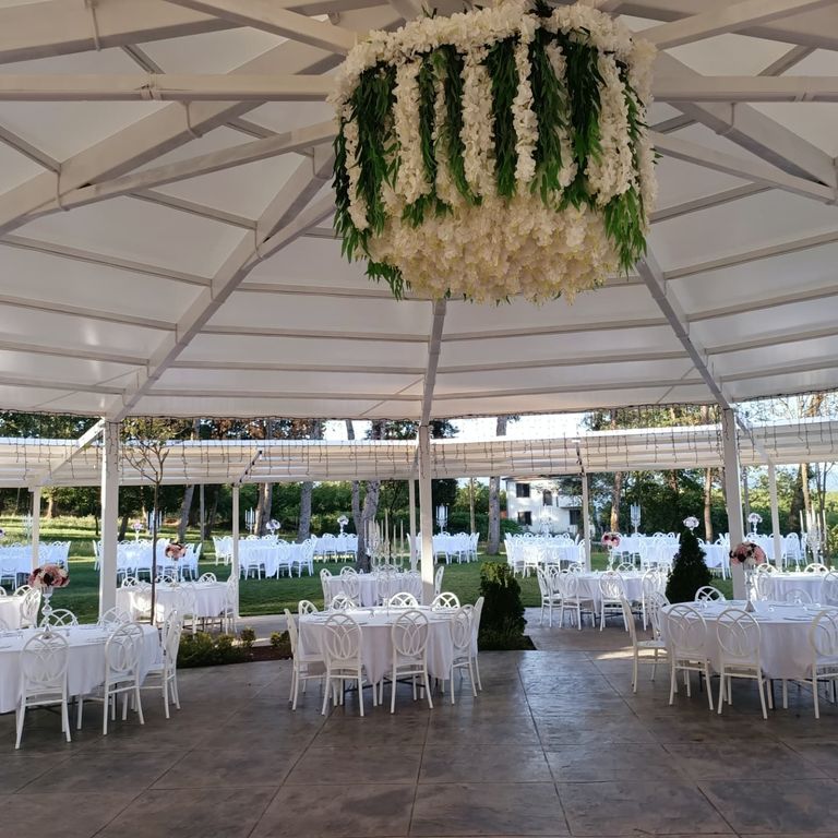 Mekanın dekorasyonunda beyazın hakim olduğu modern ve sade bir konsept tercih edilmiş. Kristal şamdanlar, çiçek aranjmanları ve zarif masa düzeni mekana şıklık katıyor. Yuvarlak masalar ve özel tasarım sandalyeler, bahçenin doğal dokusuyla uyumlu bir görünüm oluşturuyor. Gelin–damat sahnesinde kullanılan çiçekli arka plan ve ışıklandırma ise etkileyici bir davet alanı yaratıyor.