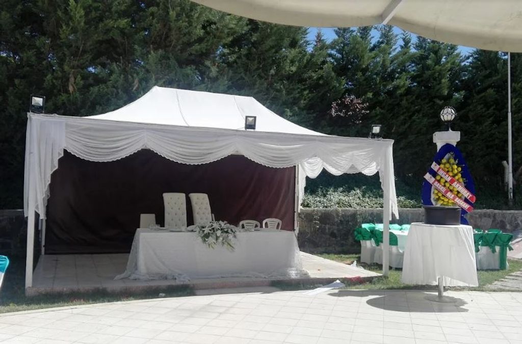 Mekanın açık hava davet alanı, çim zemin, geniş oturma düzeni ve sade sahne kurulumuyla konukların konforlu bir şekilde ağırlanmasını sağlıyor. Sahne bölümünün üstü tente ile gölgelendirilmiş olup, nikah törenlerinin daha sakin bir alanda yapılmasına imkan tanıyor. Yüksek ağaçlarla çevrili bahçe, rüzgarı kesen yapısıyla açık hava organizasyonları için korunaklı bir alan oluşturuyor. Kare masalar ve geniş yerleşim düzeni kalabalık davetlere uygun.