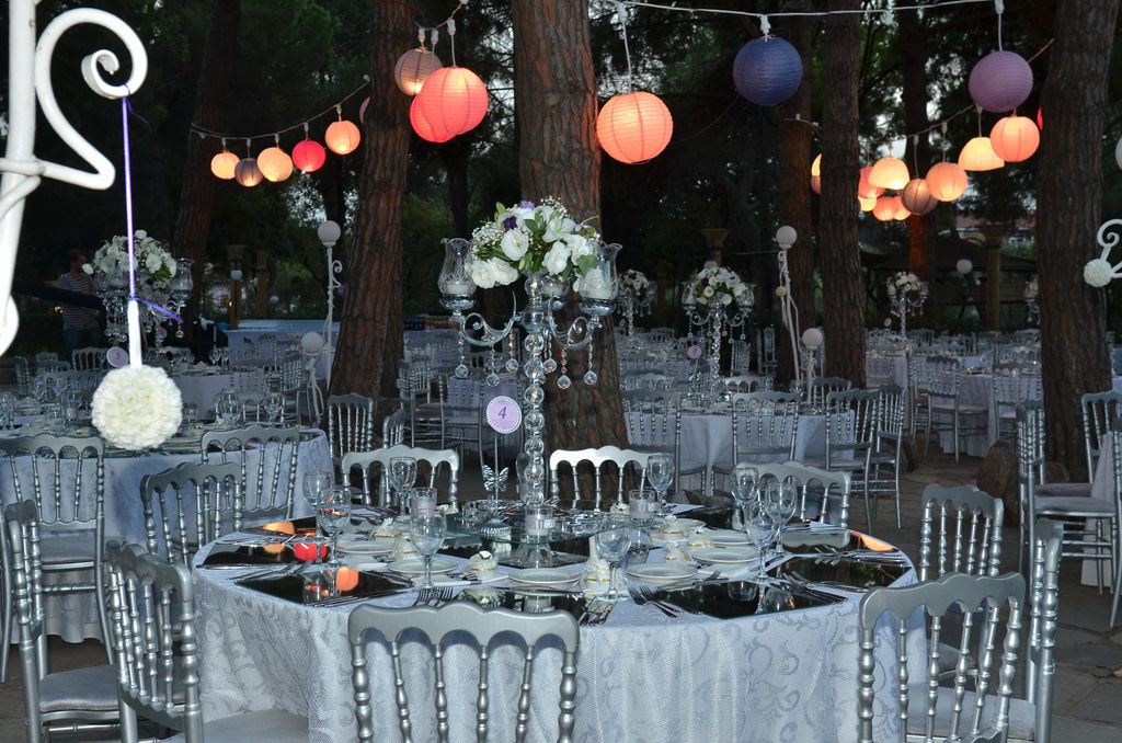 Rustik ve bohem dokunuşlardan ilham alınan mekanımızı, cam şamdanlar ve sarkıt dilek fenerlerinin yarattığı büyülü ışıltıyla buluşturuyoruz. Çiçekli giriş takı ve sandalyelere işlenen tül detaylarıyla her köşeye zarif bir anlam katıyoruz. Yuvarlak masalar ve şık Tiffany sandalyelerle bütüncül bir görsellik oluşturuyor, talebe göre kişiye özel süsleme alternatifleriyle hayalleri somutlaştırıyoruz.