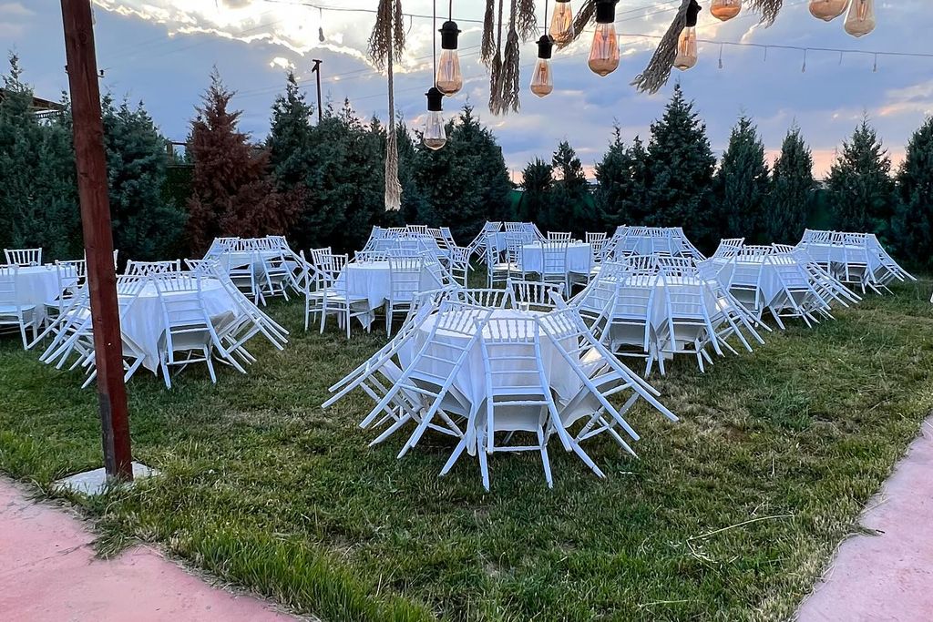 Mekanımızda beyaz ağırlıklı dekorasyon tercih ediyor, ferah ve göz alıcı bir atmosfer oluşturuyoruz. Beyazın sade ve zamansız şıklığını, detaylarda yaptığımız özenli dokunuşlarla tamamlayarak hayal ettiğiniz romantik kır düğünü ambiyansını ortaya çıkarıyoruz. Davet alanımızda yuvarlak masalar ve tiffany sandalyeler kullanıyoruz. Şık ve sade bir görünüm sunan masa ve sandalyelerimizi, isteğinize göre farklı renk ve konseptlerde süsleyebiliyoruz.