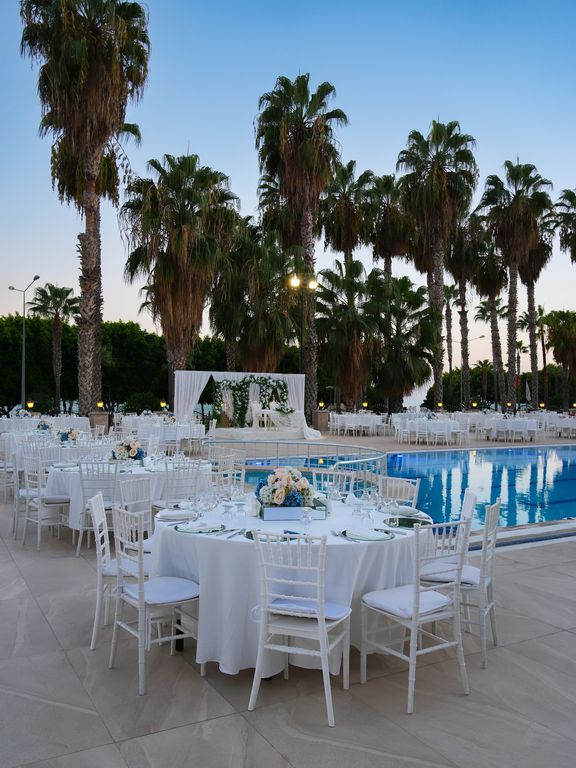 Misafirlerimizi, ağırlıklı olarak havuz başındaki davet alanımızda konuk ediyor, muhteşem bir deniz manzarasının da eşlik ettiği bu alanda, 1.000 ila 2.000 misafirimizi ağırlayabiliyoruz. Kapalı davet salonumuzdaysa, 100 ila 200 misafirimize ev sahipliği yapıyoruz. Davet masalarımızı havuzun etrafına yerleştiriyor, dev sahnemizi de tüm misafirlerimizin göreceği şekilde konumlandırıyoruz. Alanımızı süsleyen büyük palmiyeler sayesinde, hoş bir kır düğünü atmosferi yakalıyoruz.