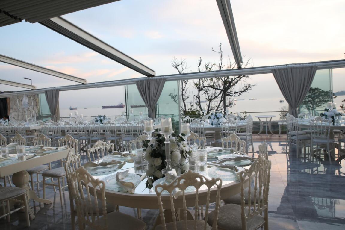 Denizin hemen kıyısında konumlanan mekanımızda, etkileyici deniz manzarasıyla birlikte 300 kişiyi mutlulukla ağırlıyoruz. 4 mevsim boyunca davetlerinizi kutlayabileceğimiz mekanımızda açılır kapanır tavan sistemi mevcut. Rahatlığı, ferahlığı, genişliği hissedebileceğiniz yüksek tavanlı yapısı işletmenin avantaj sahibi olduğu bir diğer nokta. Kız isteme merasimini yapacak olanlar için locamız da bulunuyor.