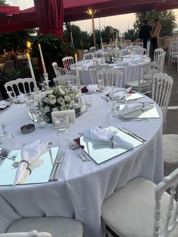 Davet alanlarımızın romantik bir atmosfer kazanması için beyazın masumiyetini ve nahifliğini öne çıkaran bir tasarım konsepti oluşturduk. Beyaz napolyon sandalyelerimiz, 10 kişilik beyaz yuvarlak masalarımızla buluşarak kare şeklindeki ayna suplalar, kadehler, mumluklar, gümüş numaratörler ve çiçek buketleri ile zarif bir görünüm elde ediyoruz. Napolyon sandalyelerimizin yerine giydirilmiş ve özel olarak süslenmiş klasik sandalye seçeneğimizle de etkileyici bir atmosfer oluşturabileceğinizi belirtmekte fayda var.