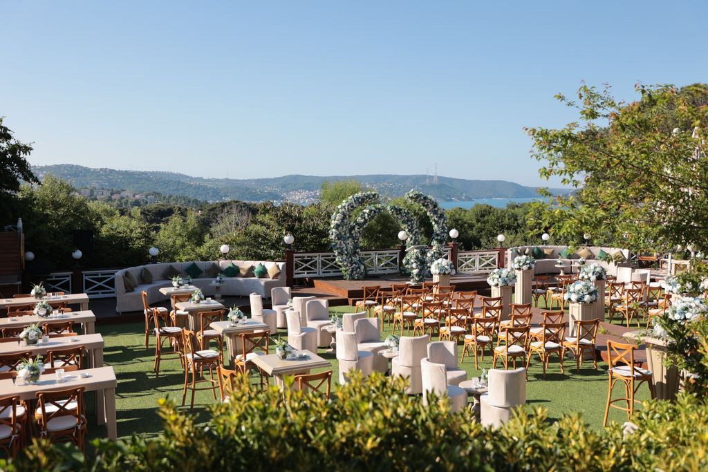 Yemek alanında yuvarlak ve dikdörtgen lake masalar kullanıyor bunları ahşap sandalyeler ile tamamlıyoruz. Masa dekorasyonlarında size, davet stilinize uygun farklı alternatifler sunuyoruz. Askılı lambalar ve mumlar ile ortamı hoş bir şekilde aydınlatıyoruz. Boğaz manzarası eşliğinde ve modern tarzda düzenlediğimiz bir alan olan welcome kokteyl ve nikah alanında çokça tercih edilen kilise düzeni kullanıyoruz.