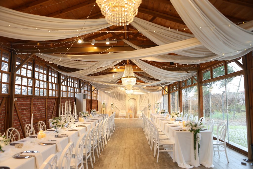 2 farklı alanımız, 2 ayrı ambiyans anlayışıyla tasarlandı. Ahşap detaylar ve beyaz tonların ön plana çıktığı salonumuzda tül süslemeler, yumuşak ışık geçişleri ve zarif masa düzenleriyle romantik bir ortam kuruyoruz. Diğer alanımızda ise kahverengi kadife kumaşlar, kristal avizeler ve sıcak tonlu aydınlatmalarla nikah törenleriniz için sofistike bir atmosfer sunuyoruz.