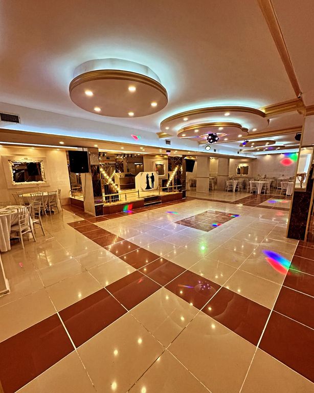 Salon İnci’nin ferah ve aydınlık salon yapısı, yüksek tavan etkisi yaratan ışık detaylarıyla bütünleşerek geniş bir kullanım alanı oluşturuyor. Büyük dans pisti, kalabalık organizasyonlarda dahi rahat bir hareket alanı sağlıyor. Yuvarlak masa düzeni, konukların görüş alanını kapatmayacak şekilde planlanmış. Salonun şehir içi konumu, pratik ve kolay bir davet deneyimi sunuyor.