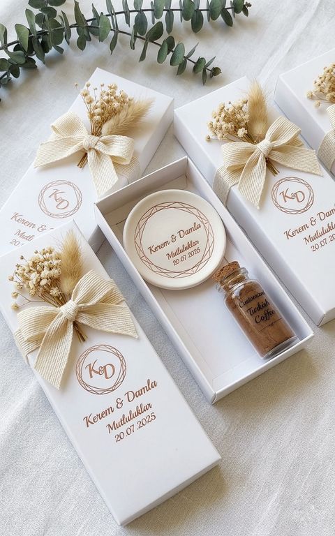 Kuru çiçek ve fiyonk detaylarıyla hareketlendirilmiş sade kutunun içinde keyif hediye etmek mi? Küçük şişelere doldurulmuş Türk kahveleri, en zarif ve sade bir sunumla sunulabilir. Şık ve minimal bardak altlığı da cabası! Model ilgini çektiyse, firma ile mutlaka iletişime geç!