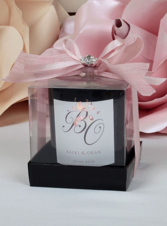 Şeffaf kare kutu içerisinde sunulan, siyah cam dekoratif mum. Üzerinde zarif baş harf tasarımı ile kişiye özel isim ve tarih baskısı yer alır. Pembe kurdele ve taş detaylı süslemesiyle hoş bir görünüm sunar. Modern ve romantik tarzıyla söz, nişan ve kına organizasyonları için özel bir hatıra hediyesidir.