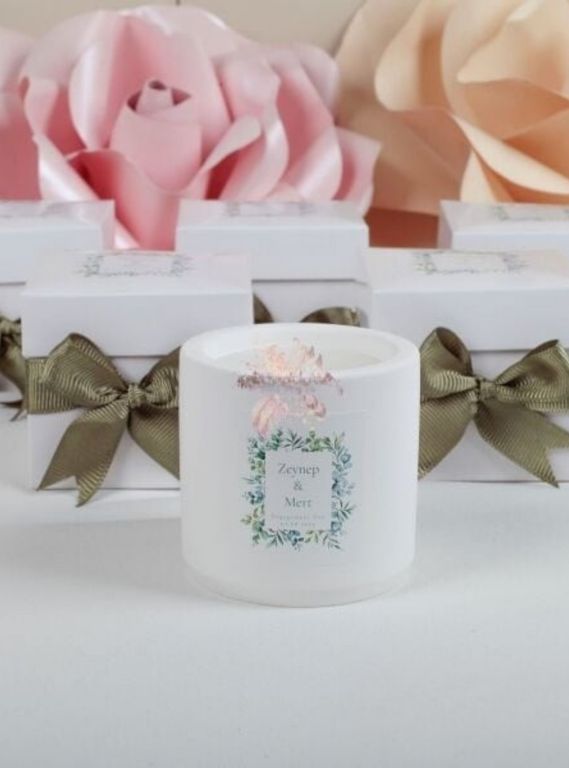 Beyaz cam kapta sunulan dekoratif mum, ön yüzeyindeki yeşil yaprak çerçeveli, isimlere özel hazırlanabilen etiketiyle kişisel bir dokunuş sunar. Yeşil tonlu kurdele ile süslenmiş şık kutusu, ürüne zarif ve bütünlüklü bir görünüm kazandırır. Romantik ve sade tasarımıyla söz, nişan, nikâh ve özel davetlerde anlamlı bir hatıra olarak tercih edilebilecek şık bir seçenektir.