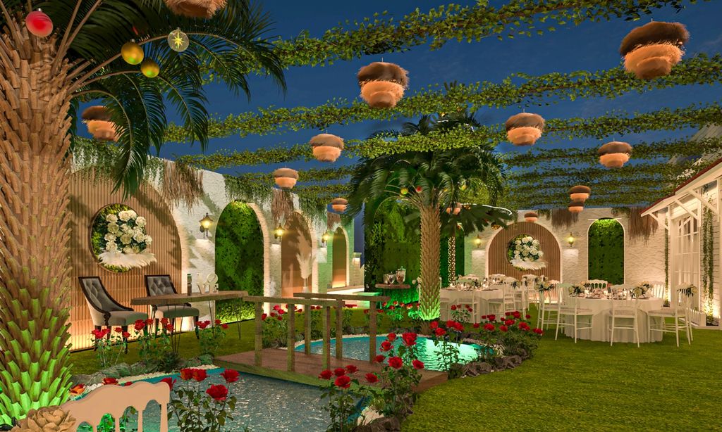 -Çim zeminli açık davet alanımız bohem atmosferiyle çiftleri bekliyor. Doğallığıyla öne çıkan bahçemizi pembe çiçekler süslüyor. Burada misafirlerinizi yuvarlak masalarda ve ahşap sandalyelerde ağırlamayı tercih ediyoruz. Kokteyl konseptli davetler için bistro masaları da kullanabiliyoruz. Masalarda çiçek ve mum süslemelerinden faydalanıyoruz.