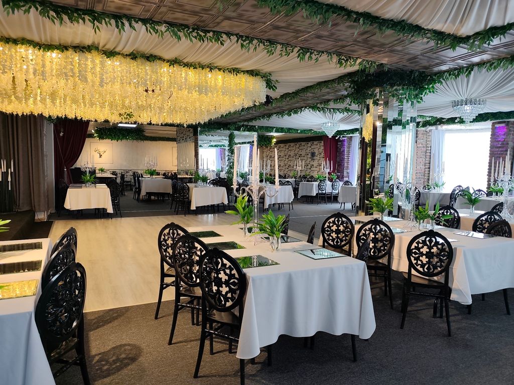 Dikdörtgen şölen masaları, beyaz ve siyah masa örtüleriyle özenle hazırlanıyor. Masalarda kullanılan gold ve gümüş aksesuar detayları, zarif bir atmosfer yaratıyor. Yapay çiçeklerle süslenmiş masalar, doğayla iç içe bir estetik sunarken, iç mekanda yer alan yeşil süsleme detayları da mekanı canlandırıyor.Siyah venüs sandalyeler, şıklığı ve konforu bir araya getirerek oturma düzenini tamamlıyor. Farklı organizasyonlar için sunulan sandalye seçenekleri, her türlü tema ve tarza uyum sağlıyor. Peçete ve masa üstü dekorasyon seçenekleri, detaylara özel bir dokunuş katıyor. Arka plandaki nişan süslemesi ise mekanı romantik ve özel kılıyor.