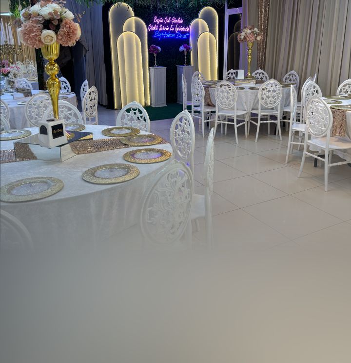 Modern ve ihtişamlı • Yüksek tavan • Geniş dans pisti • DJ • Alkol servisi yok • Kolay ulaşım • Nişan süslemesi • Nişan tepsisi