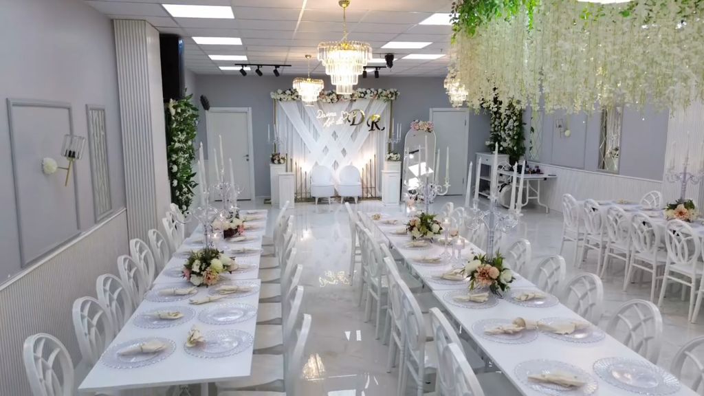 Kayaşehir AVM Elmas Davet Salonu’nda çiftlerimizi sabit model masa ve sandalyelerimiz ile karşılıyoruz. Fakat müşterilerimizin tercihine bağlı olarak şeffaf ya da gold renkli supla seçeneklerimizi kullanabiliyoruz. Nişan arka plan kurulumları için de pek çok farklı seçenek sunuyoruz. Beyazın öne çıktığı salonumuzda tavandan sarkan çiçek süslemeleri ortama romantik bir hava katıyor.