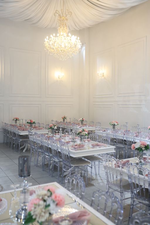 Salon, ince düşünülmüş detaylarıyla akılda kalıcı söz ve nişan etkinliklerine ev sahipliği yapıyor. Dikdörtgen aynalı masalar beyaz bacakları ve kenarlarıyla şıklığı ön plana çıkarırken beyaz sandalyelerle uyumlu bir görünüm sunuyor. Mumluklar, şamdanlar ve suplalar gümüş renkteki aksesuarlarla tamamlanarak lüks bir dekor oluşturuluyor. Yapay çiçeklerden dizayn edilen fotoğraf çekim alanıyla duvar ve tavan dekorasyonlarıyla mekanda estetik bir dokunuş sağlanıyor.