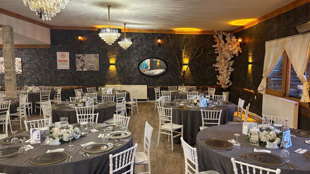 Misafirlerinizin rahatlığı için 10 kişilik yuvarlak masalar tercih ediyor, bu masaları ahşap sandalyelerle tamamlayarak sıcak ve davetkâr bir ortam sunuyoruz. Masaların üzerinde, doğal dokunuşlar taşıyan kütük mumluklar ve vazolar mekânımıza zarif bir şıklık katıyor. Beyaz masa örtülerinin sadeliği, kahverengi çerçeveli şeffaf Amerikan servislerle birleşerek sade ama etkileyici bir görünüm sağlıyor.