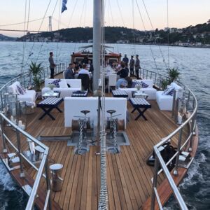 İstanbul teknede düğün yapma fikri size sıcak geliyorsa, Teras 212 Boat’ın birbirinden şık teknelerini görene kadar bekleyin. Modern ve çağdaş tasarımıyla çiftlerden tam puan alan tekneler, talep edilirse kişiye özel süslenebiliyor. Beyaz, rahat koltuklarla ve uzun masalarla donanmış güvertede konuklarınızı hem konforlu hem de şık bir ortamda ağırlayabilirsiniz. Dilerseniz kokteyl masaları da kullanabilirsiniz.